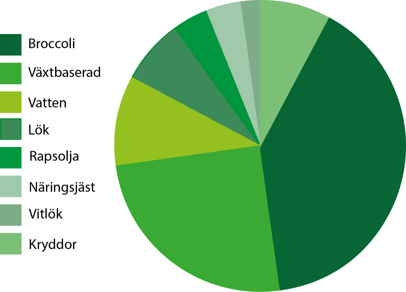 Broccoli (45 %), växtbaserad grädde (HAVRE), vatten, lök, rapsolja, vitlök, senap (SENAPSFRÖ), näringsjäst, citronsaft, potatisstärkelse, dijonsenap (SENAPSFRÖ), salt, svartpeppar, vitpeppar, muskotnöt, naturliga aromer.
